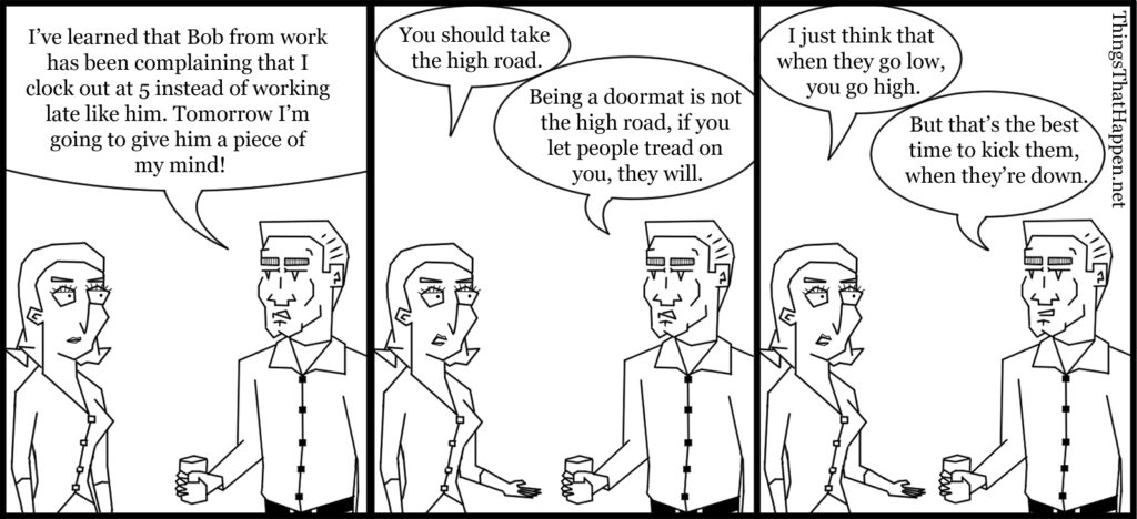 Taking the High Road by Alex Kigerl on November 6, 2022 at 5:29 pm Chapter: Comics └ Tags: being a doormat, high road, work Comment